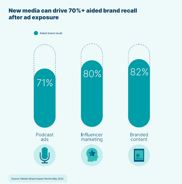 For example, podcast ads, influencer marketing, and branded content delivered over 70% in aided brand recall. But, you still need to do your homework to find the right podcast or influencer for your target. This alone tends to stop most companies from moving ahead.