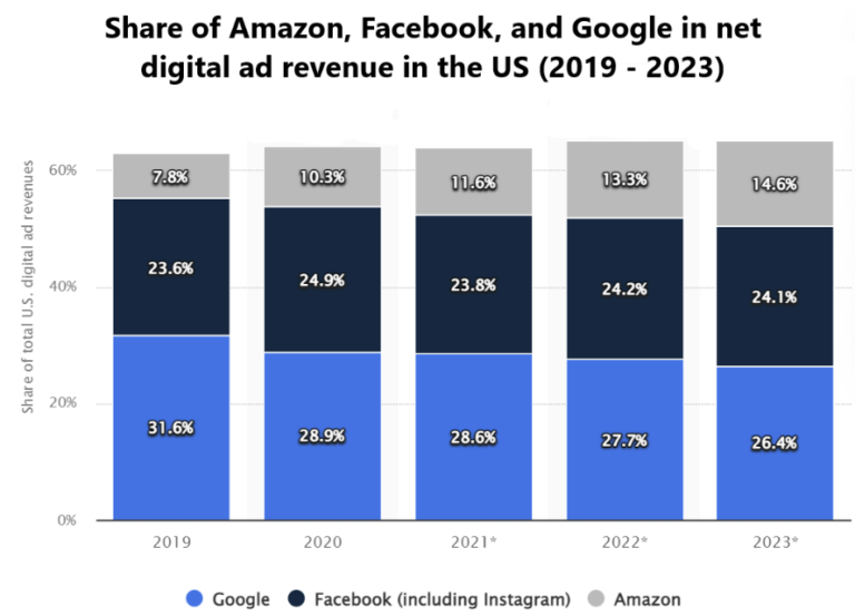 Walled gardens occupy more than half of the digital advertising landscape. The most prominent examples that we’ve all heard about are Meta (formerly Facebook), Google, and Amazon. Known as the digital ad triopoly, these three giants hold a total digital ad revenue share of 65.2%.