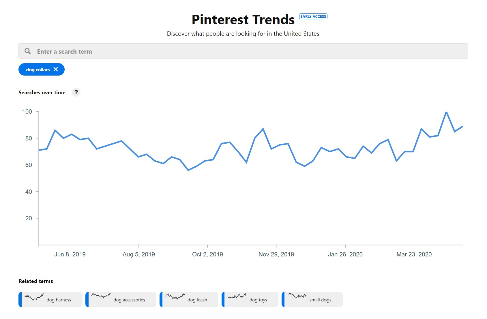 A standard marketing best practice is focusing on and around your keywords. These should start from the keywords you are ranking for now – either organically or paid search. Test them out using the social network itself to see if these same keywords are being used frequently. The example below shows Pinterest Trends, a helpful internal tool for planning.